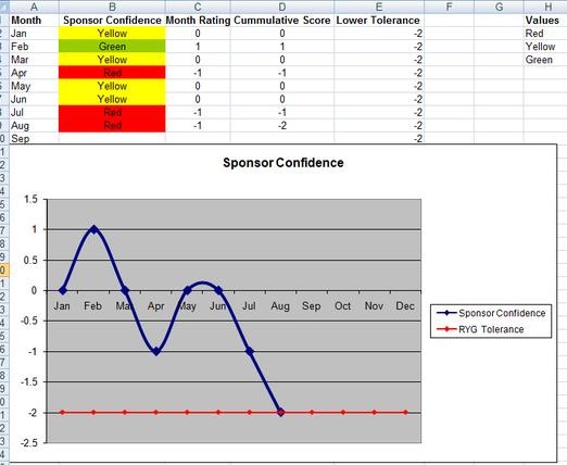 Mike Griffiths has an eloquent sponsor/ customer tracking approach that asks for a vote of confidence or satisfaction. In aggregate, this provides a customer-focused index over time. I also like the emoticons in his customer chart.