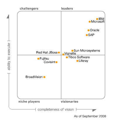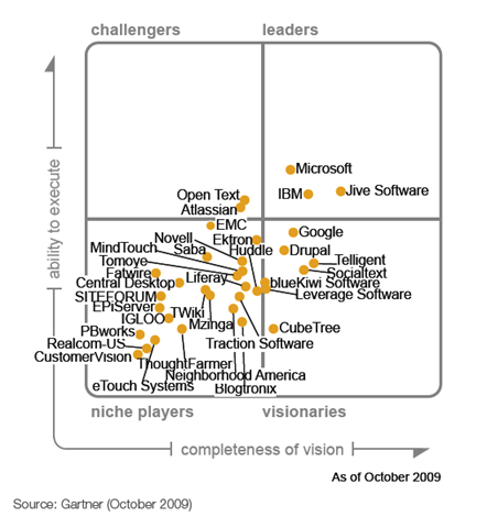 This space is crowed and still emerging. Gartner tracked over 35 vendors in the past three years and is only starting to identify leaders. Given their relative size and penetration in the market, SharePoint ranks high in ability to execute, and barely crosses into leaders for vision. It provides many of the capabilities relative to the first objective, but fall short in social networking and social computations.
