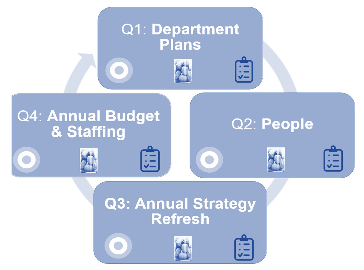 Some think of strategic planning as a one time or every 3 years exercise. In my experience, it is most beneficial to think about it as an ongoing process that has a key focus on at least a quarterly cycle.