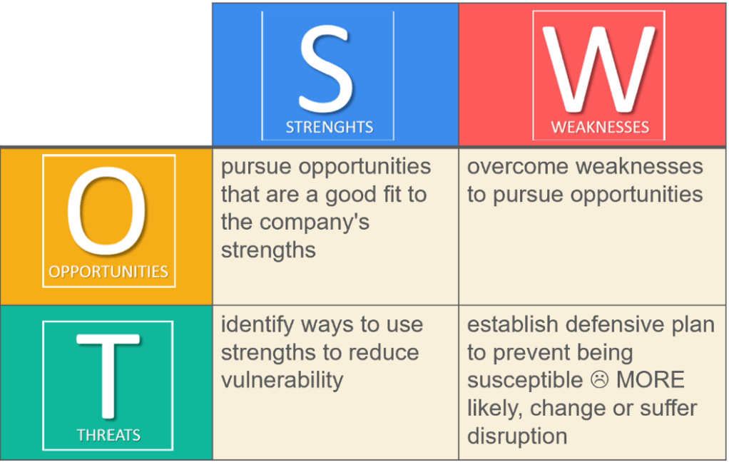 For simplicity’s sake, I still call this swot analysis. I just spell it SW-T or SWoT. My experience is that this approach is simpler, less confusing and leads to better ideas about how to prepare for future success.