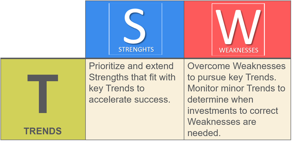 These external Trends then lead to a simple matrix to contemplate strategic action when crossed with internal Strengths and Weaknesses: