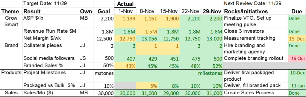 - 5 min – Score Card Review: This reminds team of Goals and Rocks for the quarter and is a chance to note the good and bad to identify if team is on track for achieving Rocks. Any issues identified go on the list and may be assigned an owner. It is not the time to solve issues (a rule for all agenda items before 5.)
