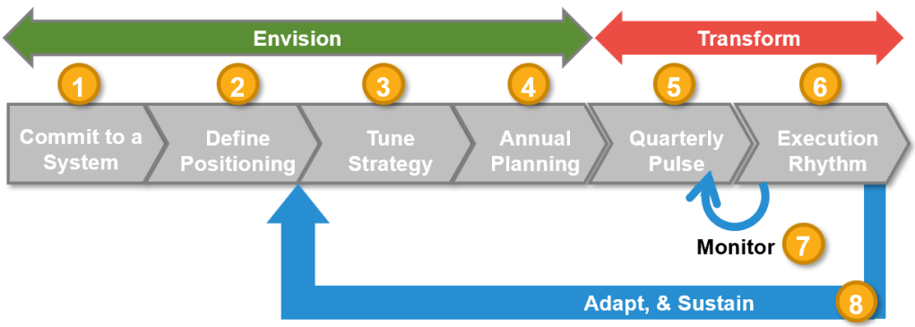 Healthy organizations view strategy as an ongoing process that allows them to define and execute their mission in a way that grows steadily toward their vision. A strategic operating system links planning with execution and feedback. The system that you choose must be made explicit to create buy-in, a common language, and shared accountability to making the system work.
