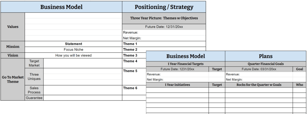 The first page documents your Positioning and Strategy. Positioning includes the busines model elements that should be rock solid: Mission, Values, and Vision. These guide key choices and help to give direction when uncertainty rises. When you get them right, you can carve them in stone to endure beyond anyone’s tenure in the company. Strategy in this context refers to the long-term plan of action or policy designed to achieve the Positioning. Its sets the Themes and Objectives for the next three to five years. Themes are broader than plans or programs in that they offer guidance about what is needed without limiting possible plans of action. They are destination statements describing with details what the business looks like in about three years from a variety of perspectives. The Go-to-Market area documents in more detail the key Theme around how you win business and sell your products and services.