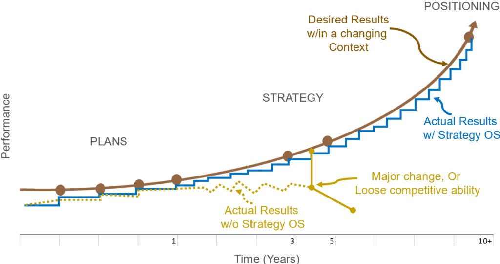 Without a functioning Strategy OS, you may be able to stay competitive in the near to medium term. But, eventually business leaders can loose focus or miss important changes in their business Context. This allows progress to drift. Eventually, most businesses hit a wall where a major change is needed. Often, this comes with risks and costs that are difficult to overcome, so business results continue to decline, putting the Positioning out of reach.