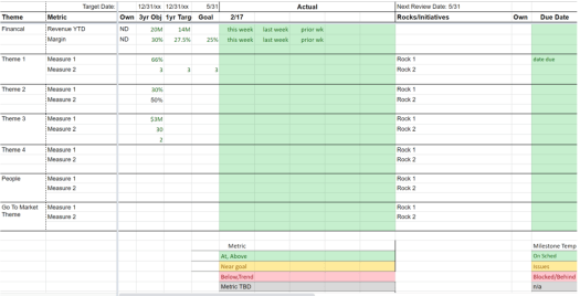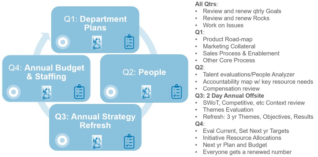 - Strategy Refresh meetings: to track quarterly and annual progress and renew Rocks.