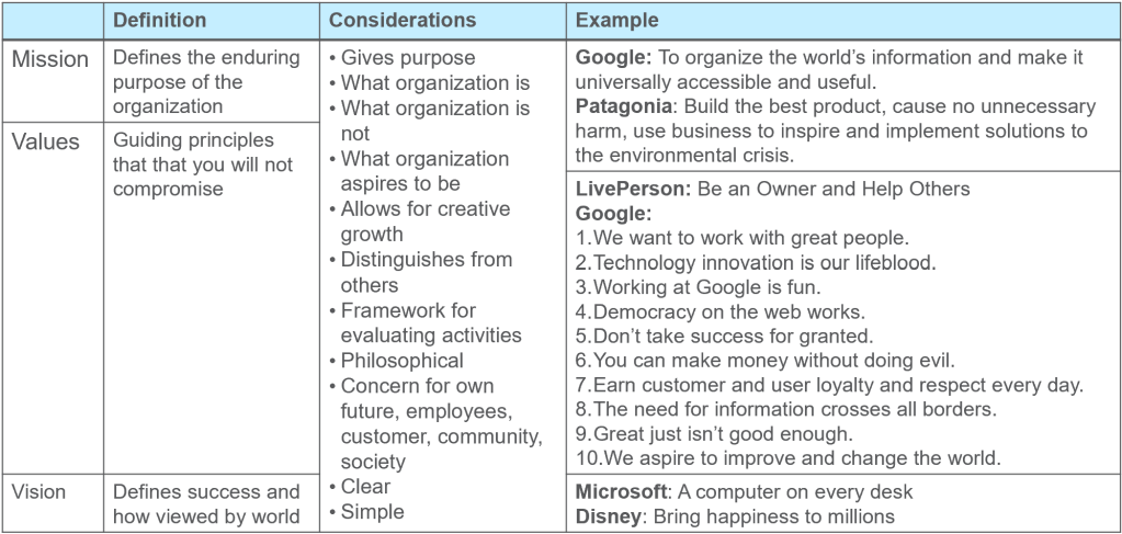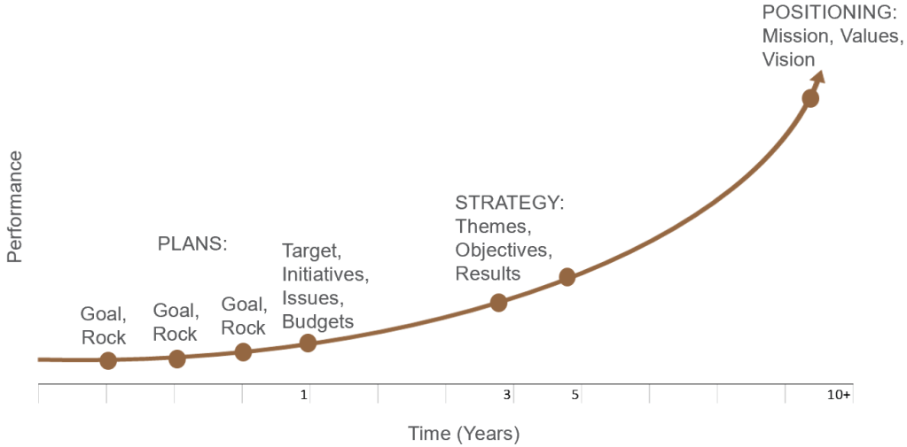 Positioning includes the strategy elements that should be rock solid: Mission, Values, and Vision. These guide key choices and help to give direction when uncertainty rises. When you get them right, you can carve them in stone to endure beyond anyone’s tenure in the company.