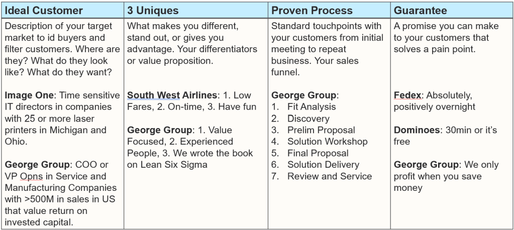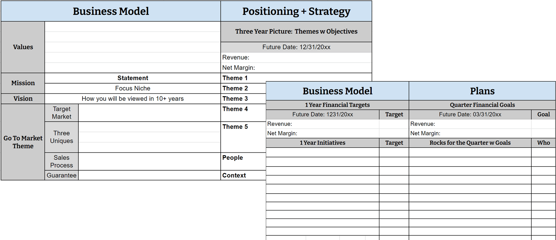 Every Strategy must include two specific Themes: Your “Go to Market” and “Financial” themes. The Go to Market or marketing strategy Theme is how you will sell and win business within your Context. If you need a structure, borrow from what is described by Wickman (pg 55-65.) The elements are summarized with examples below: