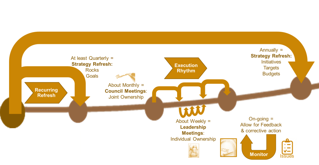Hold recurring strategy refreshes at least each quarter to renew Rocks and Goals. At these workshops, teams review success and challenges since the last refresh and commit to Rocks they will deliver before the next refresh. We call the actions that best move the strategy forward Rocks.