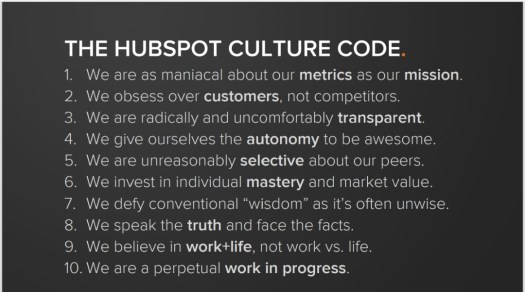 Create or refine your culture principles. These are the beliefs, values, and practices your company is based on. They define how you work together and serve as guidelines to support your mission. NetFlix’s principles are reflective of Reed Hastings foundational ideals. HubSpot started by interviewing employees to find out what they liked most about their culture and created principles from this input. Who sets examples for others? What are attributes of other brands you admire? What makes employees want to come to work? Where can we improve perceived weaknesses? The right answers shape your company culture in ways that motivate and engage your team. Here are the original principles from HubSpot:
