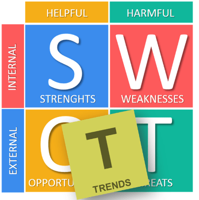 These external Trends then lead to a simple matrix to contemplate strategic action when crossed with internal Strengths and Weaknesses: